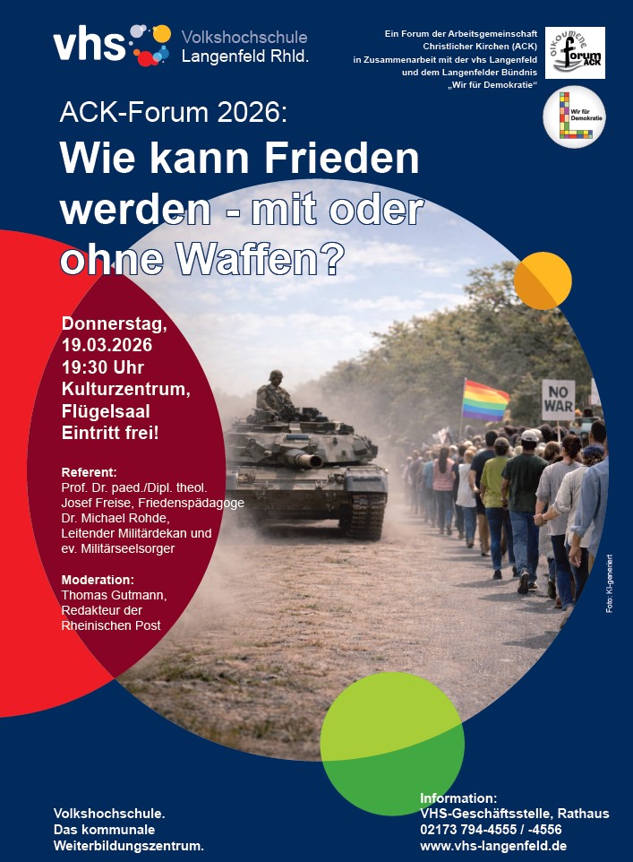 Donnerstag, 19. März 2026: Vortrag bei der Arbeitsgemeinschaft Christlicher Kirchen um 19.30 Uhr in Langenfeld zum Thema: Wie Frieden schaffen? Mit oder ohne Waffen? Es diskutieren Prof. Dr. Josef Freise und der evangelische Militärdekan Dr. Michael Rohde