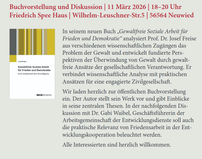 20. November 2025 um 19 Uhr: Lesung „Soziales Engagement für Frieden und Demokratie“. Josef Freise liest aus seinem neuen Buch, das im Dezember erscheint. Mehrgenerationenhaus Neustadt/ Wied. Info und Anmeldung unter www.kvhs-neuwied.de/G149-25-2 oder 02631 347813.Flyer_Lesung-Freise_-Soziales-Engagement-fuer-den-Frieden