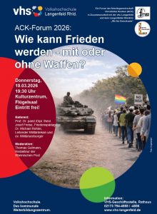 10. Januar 2026, 10 bis 16 Uhr im Haus der Kirche, Bonn: Friedenswerkstatt des Arbeitskreises Frieden der ökumenischen Netze und Gruppen in der Evangelischen Kirche im Rheinland (EKiR) in Kooperation mit dem Evangelischen Forum Bonn mit einer Einführung von Josef Freise: „Wider die Kriegstüchtigkeit – Schritte zur Friedensfähigkeit“ Flyer Friedenswerkstatt